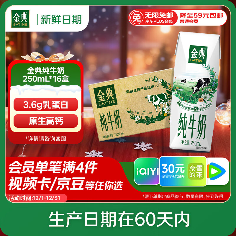 包邮 伊利【新鲜日期】金典纯牛奶整箱 250ml*16盒 3.6g乳蛋白 礼盒装